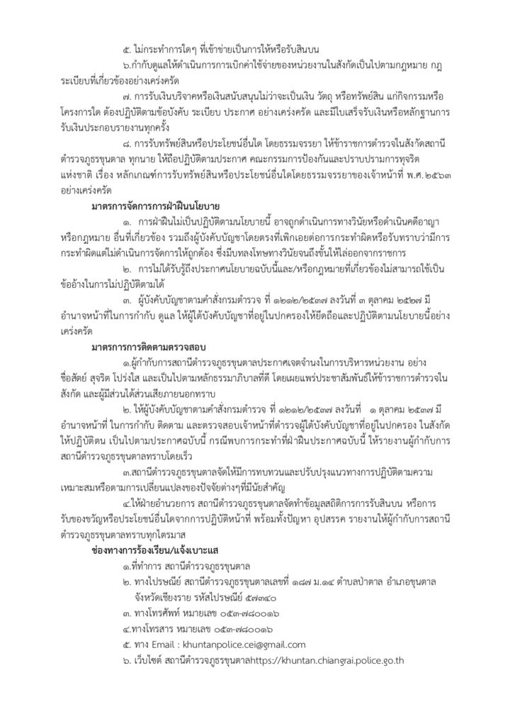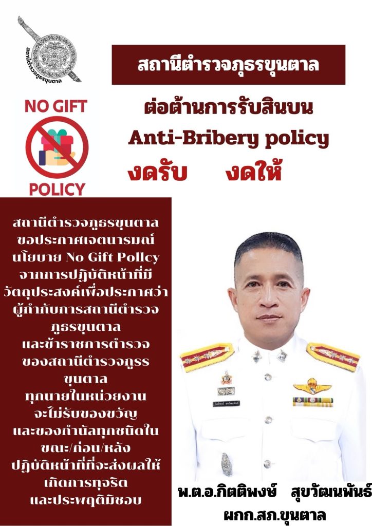 วันที่ 26 ธ.ค. 2566 เวลา 14.30 น. พ.ต.อ.กิตติพงษ์ สุขวัฒนพันธ์ ผกก.สภ.ขุนตาล ได้ประชุมประกาศเจตนารมณ์ของหน่วยงาน ประกาศเจตนารมณ์ ในการป้องกันการและต่อต้านการทุจริตชองสถานี และประกาศ เจตนารมณ์ไม่รับของขวัญ และสินบนอื่นใด ทุกชนิดจากการปฏิบัติหน้าที่ ในหน่วยงาน