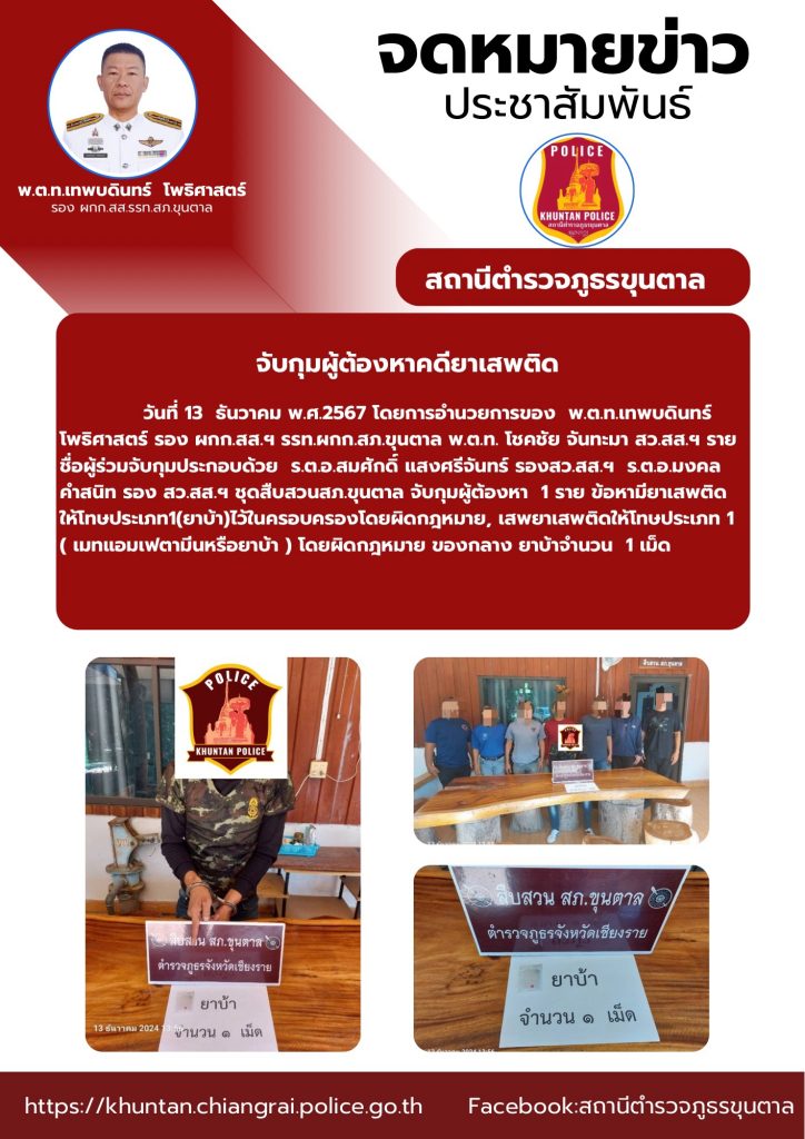 จับกุมผู้ต้องหาคดียาเสพติด 13 ธันวาคม 2567 โดย admin / ข่าวประชาสัมพันธ์,งานสืบสวน ธ.ค.67 จำนวนคนดู: 27 FacebookFacebookXXLINELine