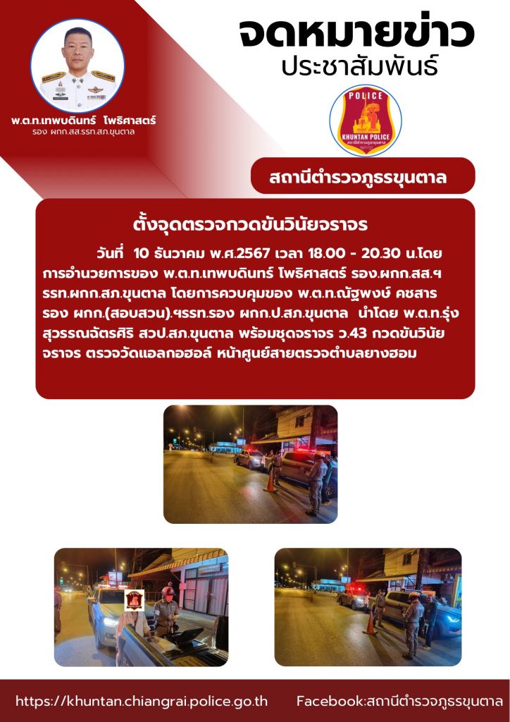 ตั้งจุดตรวจกวดขันวินัยจราจร 10 ธันวาคม 2567 โดย admin / ข่าวประชาสัมพันธ์,งานจราจร ธ.ค.67 จำนวนคนดู: 36 FacebookFacebookXXLINELine