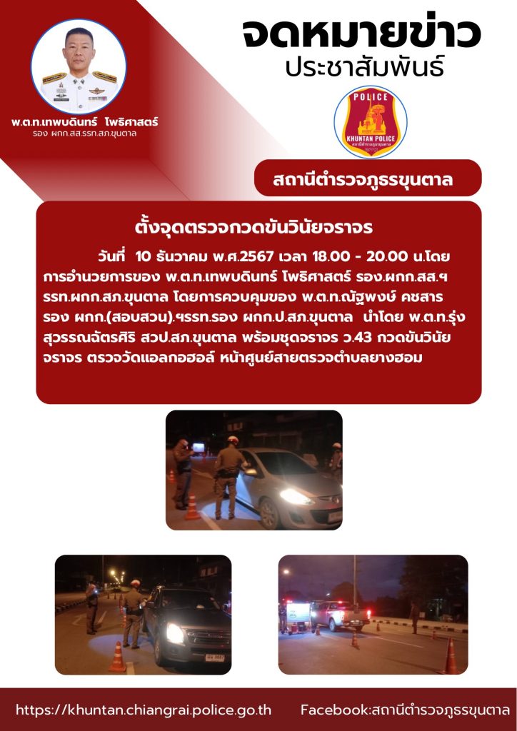 ตั้งจุดตรวจกวดขันวินัยจราจร 16 ธันวาคม 2567 โดย admin / ข่าวประชาสัมพันธ์,งานจราจร ธ.ค.67 จำนวนคนดู: 36 FacebookFacebookXXLINELine