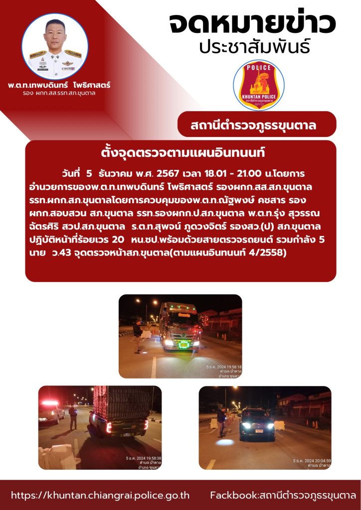 ตั้งจุดตรวจตามแผนอินทนนท์ 5 ธันวาคม 2567 โดย admin / ข่าวประชาสัมพันธ์,งานป้องกันปราบปราม ธ.ค.67 จำนวนคนดู: 44 FacebookFacebookXXLINELine