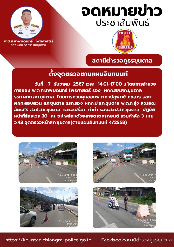 ตั้งจุดตรวจตามแผนอินทนนท์ 7 ธันวาคม 2567 โดย admin / ข่าวประชาสัมพันธ์,งานป้องกันปราบปราม ธ.ค.67 จำนวนคนดู: 38 FacebookFacebookXXLINELine