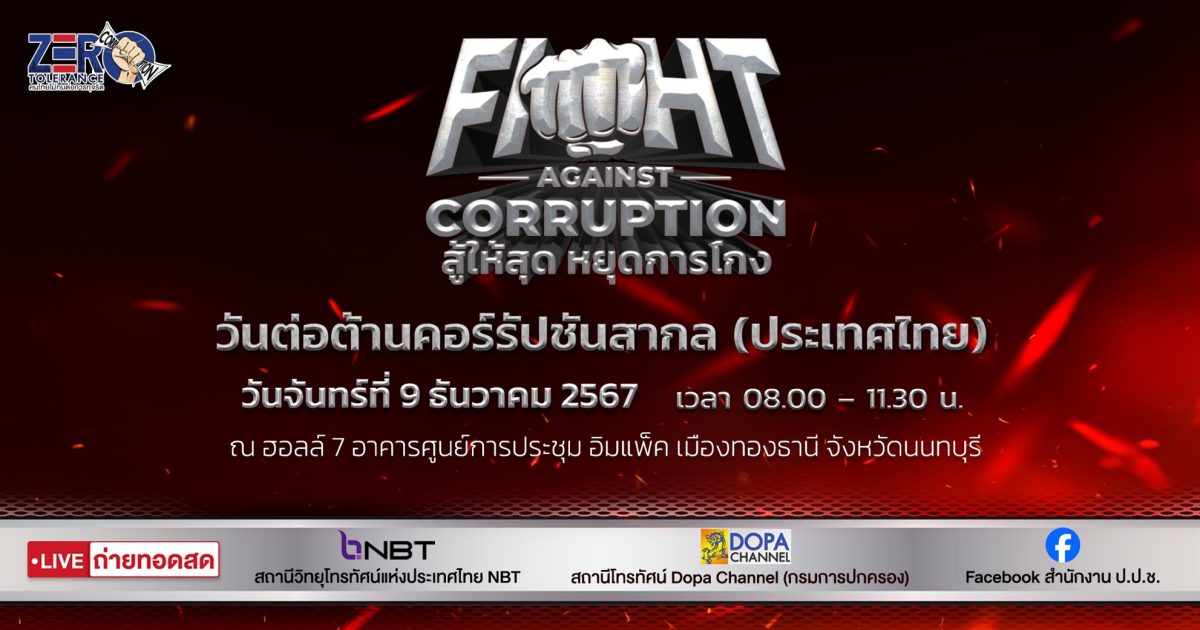 ป.ป.ช. สำนักงาน ป.ป.ท., องค์กรต่อต้านคอร์รัปชัน (ประเทศไทย) และภาคีเครือข่ายทุกภาคส่วน กำหนดการจัดงานวันต่อต้านคอร์รัปชันสากล (ประเทศไทย) ในวันจันทร์ที่ 9 ธ.ค. 2567 เวลา 08.00 – 11.30 น.ณ ฮอลล์ อาคารศูนย์การประชุม อิมแพ็ค เมืองทองธานี จังหวัดนนทบุรี และสามารถรับชมการถ่ายทอดสด ผ่านทางช่องทาง