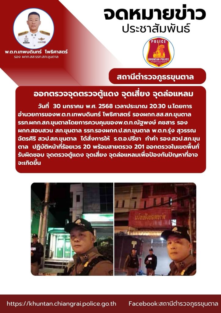 ออกตรวจจุดตรวจตู้แดง จุดเสี่ยง จุดล่อแหลม 30 มกราคม 2568 โดย admin / งานป้องกันปราบปราม ม.ค 68 จำนวนคนดู: 19 FacebookFacebookXXLINELine