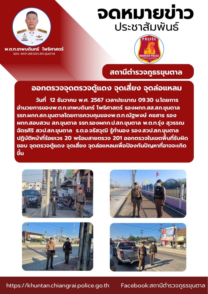 ออกตรวจจุดตรวจตู้แดง จุดเสี่ยง จุดล่อแหลม 12 ธันวาคม 2567 โดย admin / ข่าวประชาสัมพันธ์,งานป้องกันปราบปราม ธ.ค.67 จำนวนคนดู: 31 FacebookFacebookXXLINELine