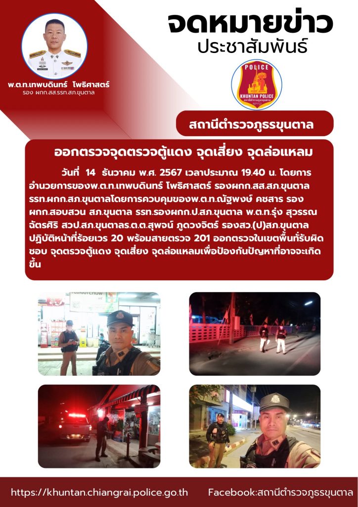 ออกตรวจจุดตรวจตู้แดง จุดเสี่ยง จุดล่อแหลม 14 ธันวาคม 2567 โดย admin / ข่าวประชาสัมพันธ์,งานป้องกันปราบปราม ธ.ค.67 จำนวนคนดู: 30 FacebookFacebookXXLINELine