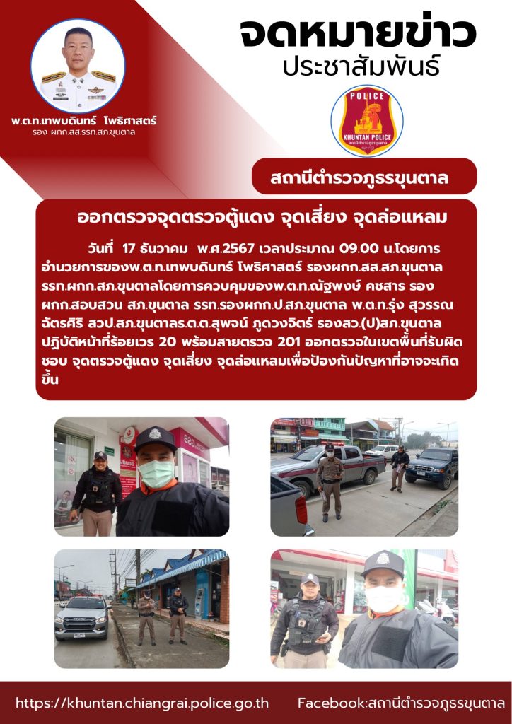 ออกตรวจจุดตรวจตู้แดง จุดเสี่ยง จุดล่อแหลม 17 ธันวาคม 2567 โดย admin / ข่าวประชาสัมพันธ์,งานป้องกันปราบปราม ธ.ค.67 จำนวนคนดู: 33 FacebookFacebookXXLINELine