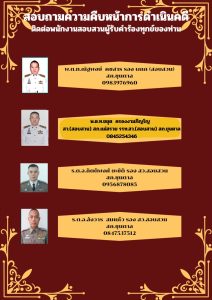 2.ติดตั้งป้ายประชาสัมพันธ์ให้ประชาชนทราบเพื่อสอบถามความคืบหน้าการดำเนินคดีโดยมีรายชื่อ พนักงานสอบสวนที่จะติดต่อพร้อมเบอร์โทรศัพท์