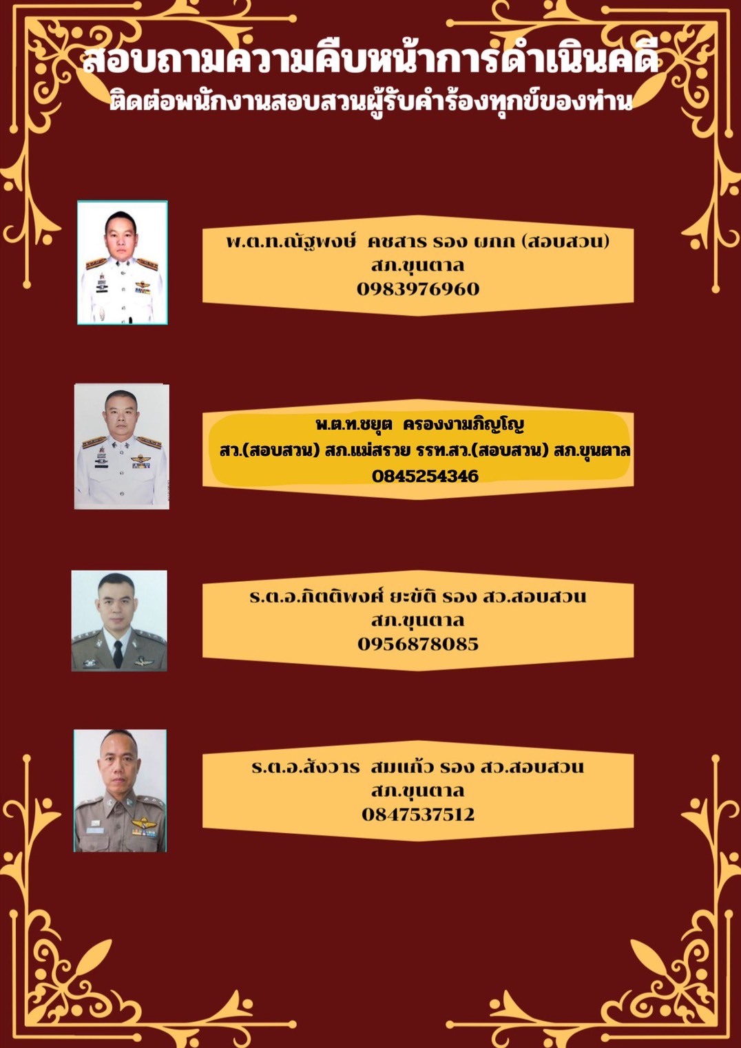 2.ติดตั้งป้ายประชาสัมพันธ์ให้ประชาชนทราบเพื่อสอบถามความคืบหน้าการดำเนินคดีโดยมีรายชื่อ พนักงานสอบสวนที่จะติดต่อพร้อมเบอร์โทรศัพท์