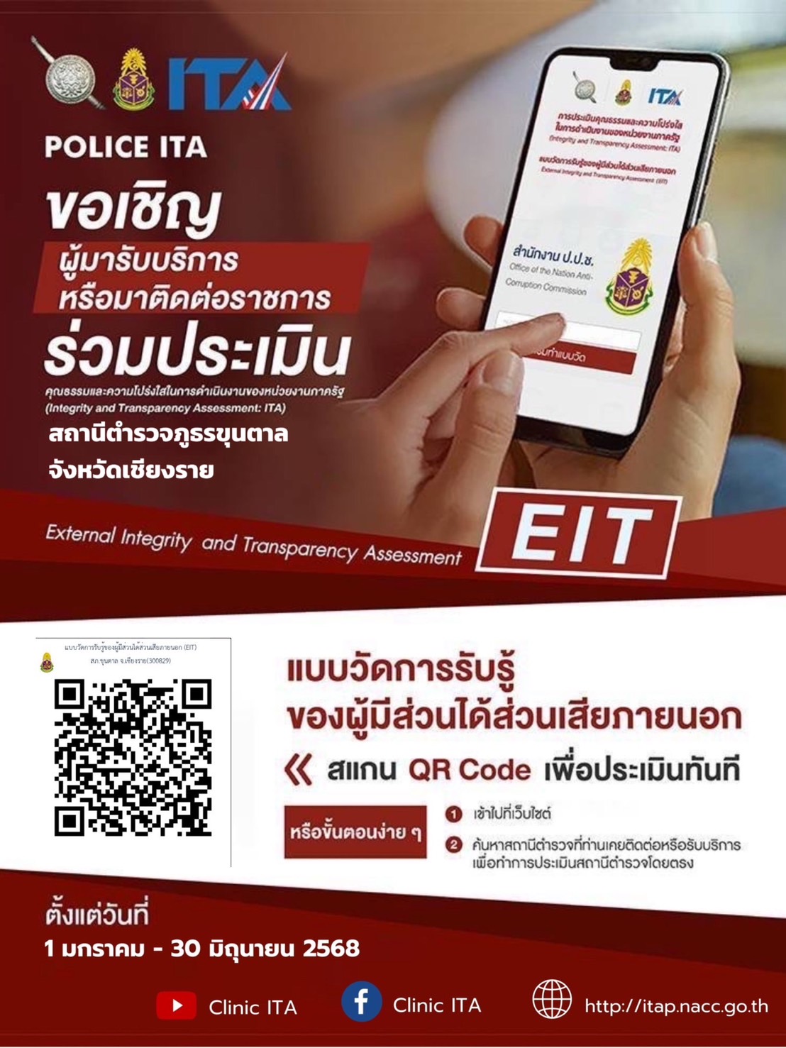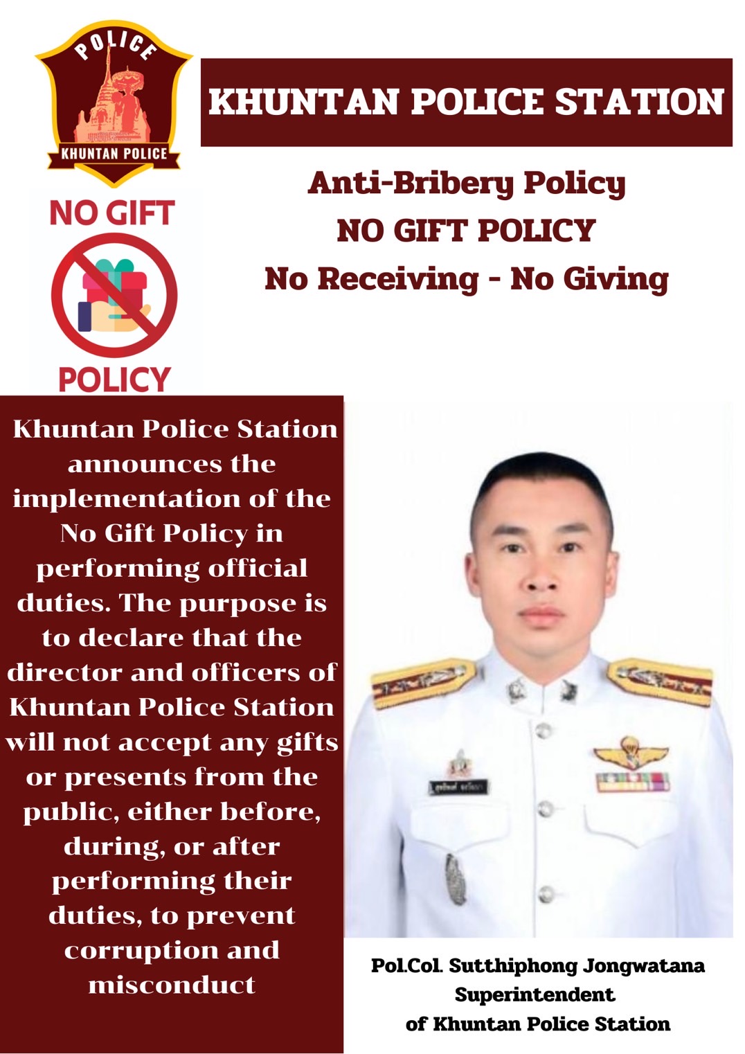 ติดไว้ในจุด บริการของสถานี เพื่อให้ประชาชนทราบว่า หน่วยงานประกาศว่าเจ้าหน้าที่ทุกคนในสังกัดไม่รับของขวัญหรือของกำนัลจากการปฏิบัติหน้าที่ และต่อต้านการรับสินบน โดย มี พ.ต.อ.สุทธิพงศ์ จงวัฒนา ผกก.สภ.ขุนตาล หัวหน้าหน่วยงานประกาศ